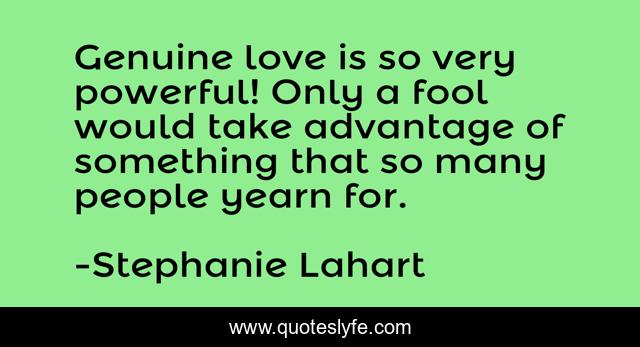 This page presents the quote "Genuine love is so very powerful! Only a fool would take advantage of something that so many people yearn for.". Author of this quote is Stephanie Lahart. This quote is about family, love-and-sayings, relationship, quote, stephanie-lahart, quotes, words-of-wisdom, genuine-love, family-relationships,.
