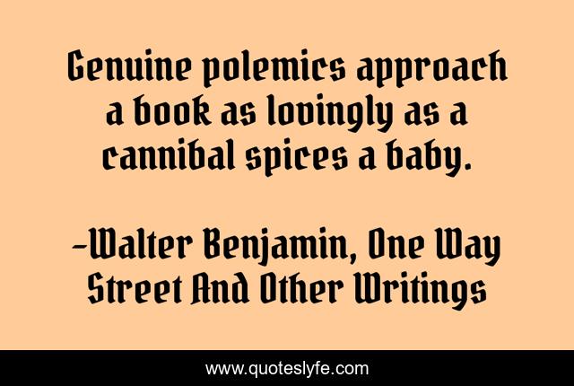 This page presents the quote "Genuine polemics approach a book as lovingly as a cannibal spices a baby.". Author of this quote is Walter Benjamin, One Way Street And Other Writings. This quote is about comedic, books, polemics,.