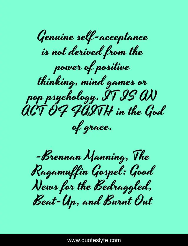 This page presents the quote "Genuine self-acceptance is not derived from the power of positive thinking, mind games or pop psychology. IT IS AN ACT OF FAITH in the God of grace.". Author of this quote is Brennan Manning, The Ragamuffin Gospel: Good News for the Bedraggled, Beat-Up, and Burnt Out. This quote is about self-acceptance, god, god-s-love, self-esteem,.