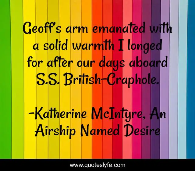 This page presents the quote "Geoff’s arm emanated with a solid warmth I longed for after our days aboard S.S. British-Craphole.". Author of this quote is Katherine McIntyre, An Airship Named Desire. This quote is about steampunk, humor, relationship, stirring, warmth,.