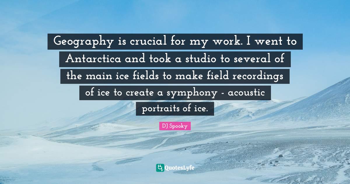 This page presents the quote "Geography is crucial for my work. I went to Antarctica and took a studio to several of the main ice fields to make field recordings of ice to create a symphony - acoustic portraits of ice.". Author of this quote is DJ Spooky. This quote is about portraits, antarctica, ice, acoustics, symphony, fields, geography, crucial, work,.