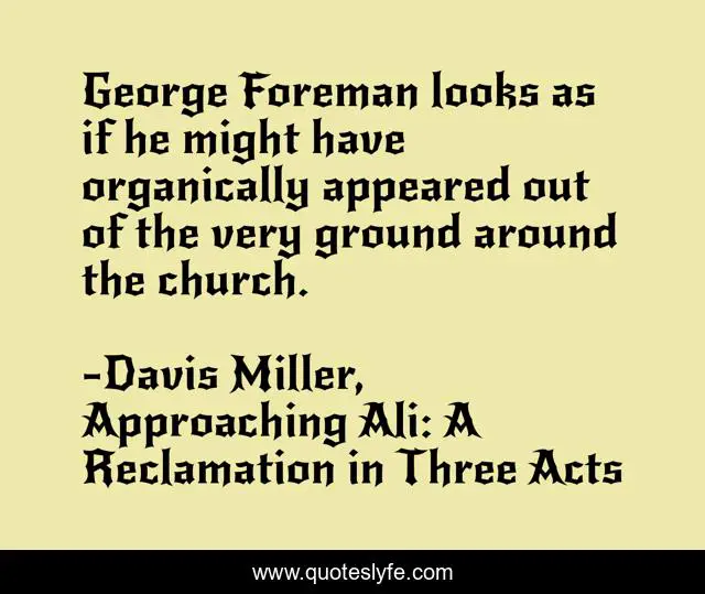 This page presents the quote "George Foreman looks as if he might have organically appeared out of the very ground around the church.". Author of this quote is Davis Miller, Approaching Ali: A Reclamation in Three Acts. This quote is about regeneration, community, renewal,.
