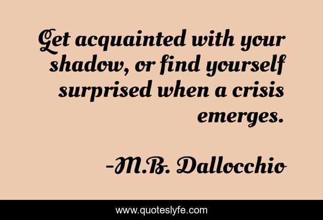 This page presents the quote "Get acquainted with your shadow, or find yourself surprised when a crisis emerges.". Author of this quote is M.B. Dallocchio. This quote is about self-awareness, danger, introspection, trauma, shadow, crisis,.