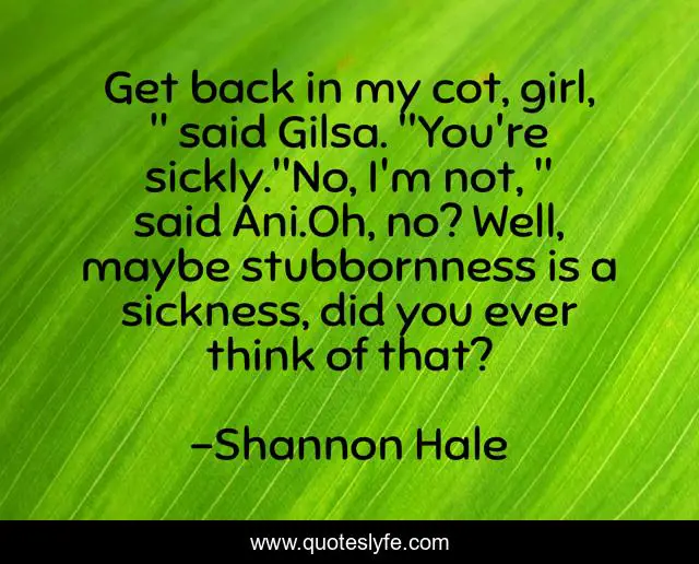 This page presents the quote "Get back in my cot, girl, " said Gilsa. "You're sickly."No, I'm not, " said Ani.Oh, no? Well, maybe stubbornness is a sickness, did you ever think of that?". Author of this quote is Shannon Hale. .