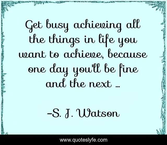 This page presents the quote "Get busy achieving all the things in life you want to achieve, because one day you'll be fine and the next ...". Author of this quote is S. J. Watson. .