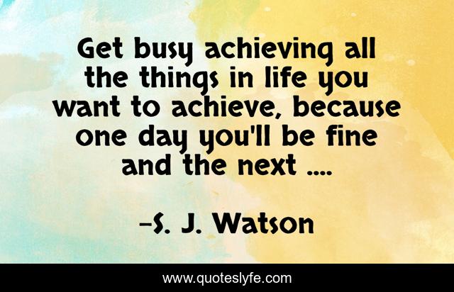 This page presents the quote "Get busy achieving all the things in life you want to achieve, because one day you'll be fine and the next ....". Author of this quote is S. J. Watson. .