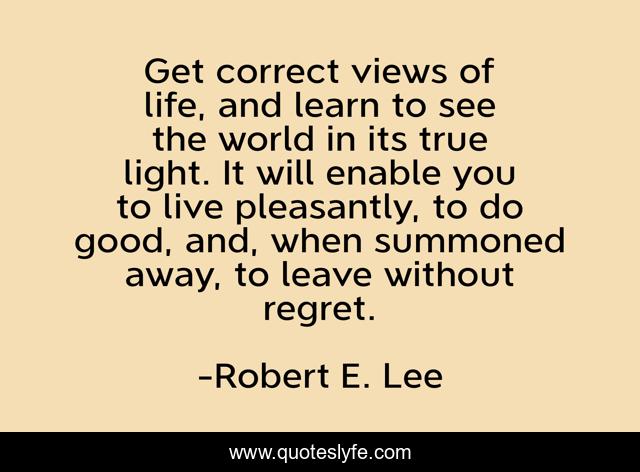 This page presents the quote "Get correct views of life, and learn to see the world in its true light. It will enable you to live pleasantly, to do good, and, when summoned away, to leave without regret.". Author of this quote is Robert E. Lee. .