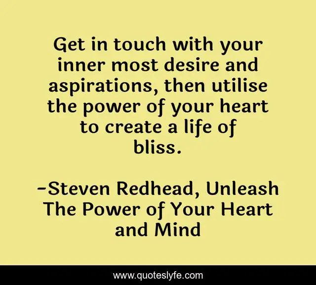 This page presents the quote "Get in touch with your inner most desire and aspirations, then utilise the power of your heart to create a life of bliss.". Author of this quote is Steven Redhead, Unleash The Power of Your Heart and Mind. This quote is about desire, heart, life, power, create, bliss, aspirations,.