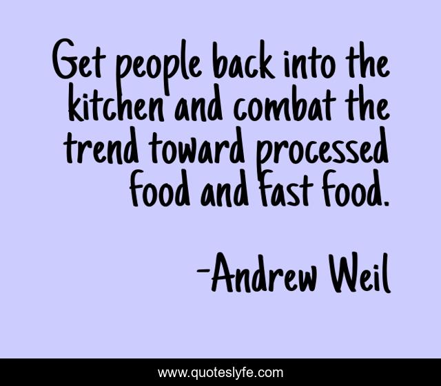 This page presents the quote "Get people back into the kitchen and combat the trend toward processed food and fast food.". Author of this quote is Andrew Weil. This quote is about people, fast, kitchen,.