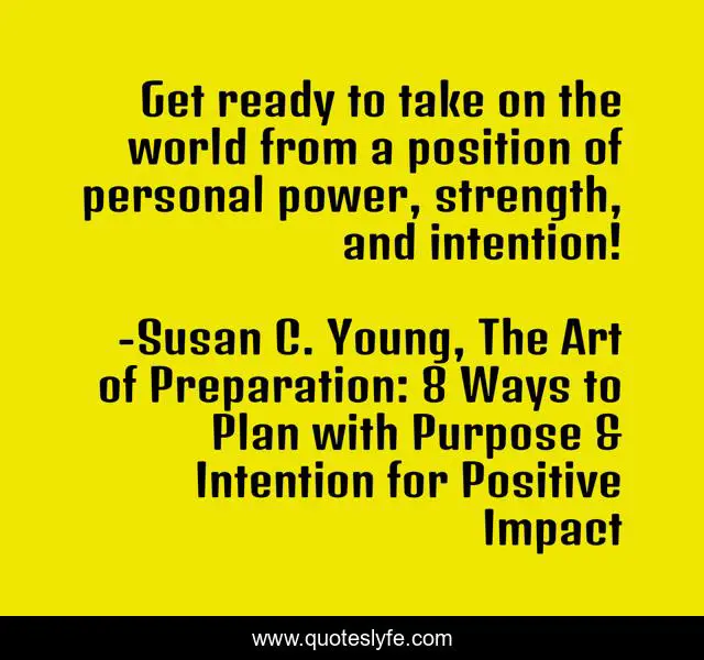 This page presents the quote "Get ready to take on the world from a position of personal power, strength, and intention!". Author of this quote is Susan C. Young, The Art of Preparation: 8 Ways to Plan with Purpose & Intention for Positive Impact. This quote is about build-confidence, susan-young, relationship, communication-skills, preparation, quotes-by-susan-c-young, motivational-speaker,.
