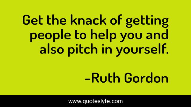This page presents the quote "Get the knack of getting people to help you and also pitch in yourself.". Author of this quote is Ruth Gordon. This quote is about helping, people,.