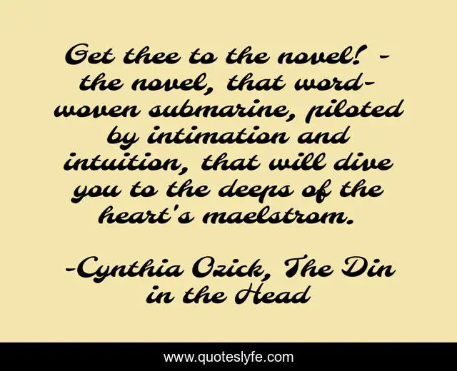This page presents the quote "Get thee to the novel! - the novel, that word-woven submarine, piloted by intimation and intuition, that will dive you to the deeps of the heart's maelstrom.". Author of this quote is Cynthia Ozick, The Din in the Head. This quote is about literature, art, the-novel,.