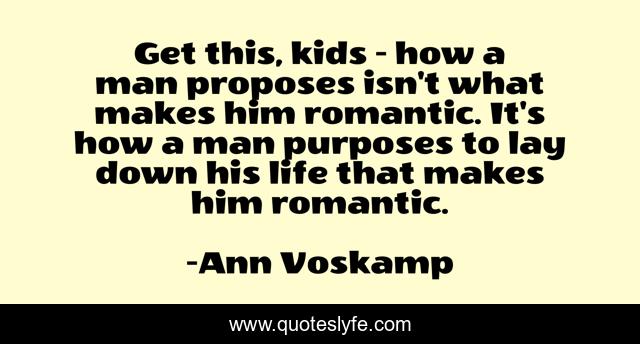 This page presents the quote "Get this, kids - how a man proposes isn't what makes him romantic. It's how a man purposes to lay down his life that makes him romantic.". Author of this quote is Ann Voskamp. This quote is about down, life, man,.