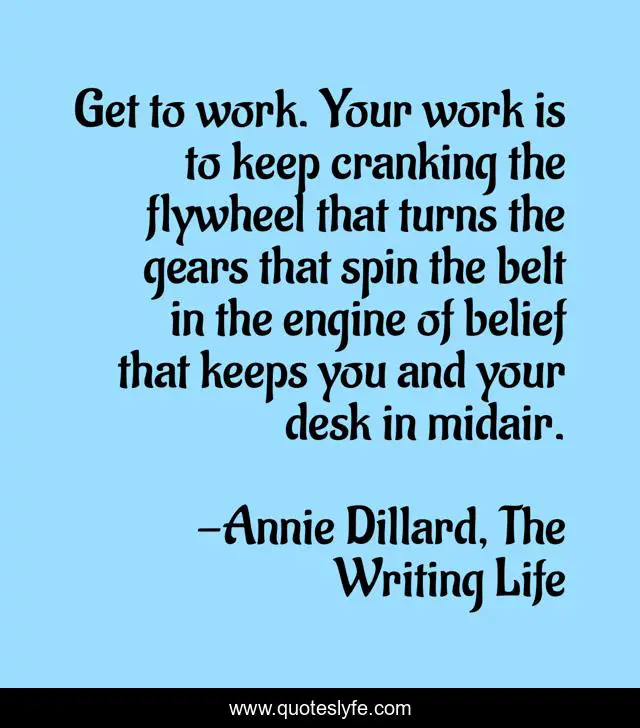 This page presents the quote "Get to work. Your work is to keep cranking the flywheel that turns the gears that spin the belt in the engine of belief that keeps you and your desk in midair.". Author of this quote is Annie Dillard, The Writing Life. This quote is about imagination, writing-life, belief, writing,.