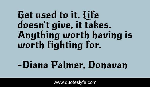 This page presents the quote "Get used to it. Life doesn't give, it takes. Anything worth having is worth fighting for.". Author of this quote is Diana Palmer, Donavan. This quote is about living, life-lessons, fight,.