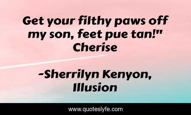 This page presents the quote "Get your filthy paws off my son, feet pue tan!" Cherise". Author of this quote is Sherrilyn Kenyon, Illusion. This quote is about cherise-gautier, funny-as-hell, a-mother-s-love, demons,.