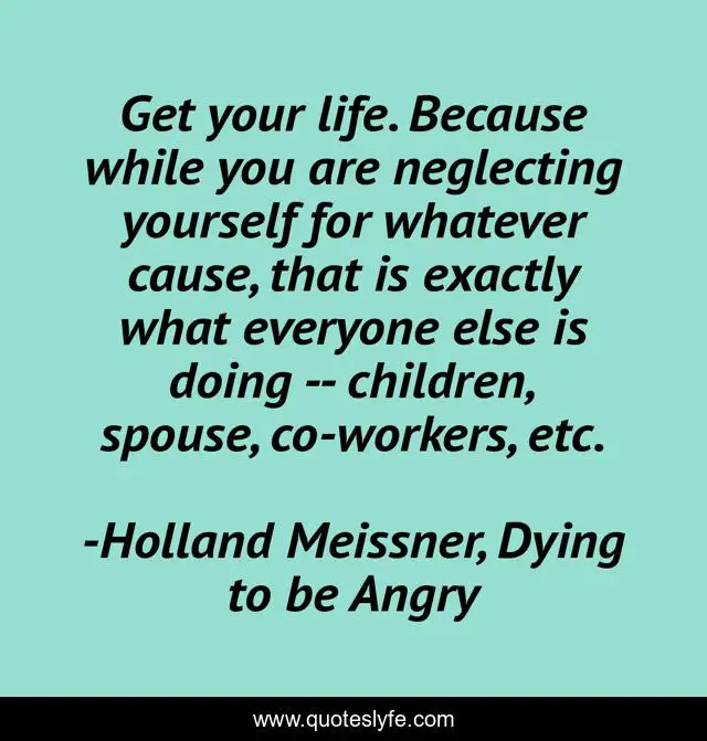 This page presents the quote "Get your life. Because while you are neglecting yourself for whatever cause, that is exactly what everyone else is doing -- children, spouse, co-workers, etc.". Author of this quote is Holland Meissner, Dying to be Angry. This quote is about inspirational-life, realism,.
