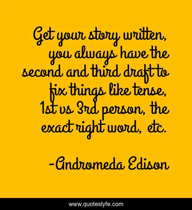 This page presents the quote "Get your story written, you always have the second and third draft to fix things like tense, 1st vs 3rd person, the exact right word, etc.". Author of this quote is Andromeda Edison. This quote is about writing, writing-process, writing-advice,.