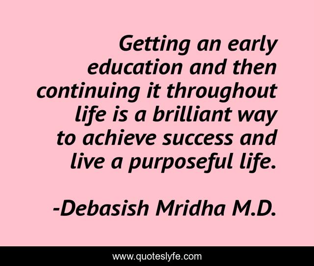 This page presents the quote "Getting an early education and then continuing it throughout life is a brilliant way to achieve success and live a purposeful life.". Author of this quote is Debasish Mridha M.D.. This quote is about early-education, philosophy, debasish-mridha, successful-life, debasish-mridha-m-d, quotes, inspirational, enthusiasm, education,.