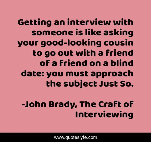 This page presents the quote "Getting an interview with someone is like asking your good-looking cousin to go out with a friend of a friend on a blind date: you must approach the subject Just So.". Author of this quote is John Brady, The Craft of Interviewing. This quote is about interviewing, journalism,.