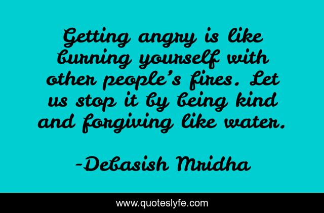 This page presents the quote "Getting angry is like burning yourself with other people’s fires. Let us stop it by being kind and forgiving like water.". Author of this quote is Debasish Mridha. This quote is about how-to-deal-with-anger, philosophy, debasish-mridha, quotes, inspirational, anger, enthusiasm, forgiving, debasish-mridha-m-d,.