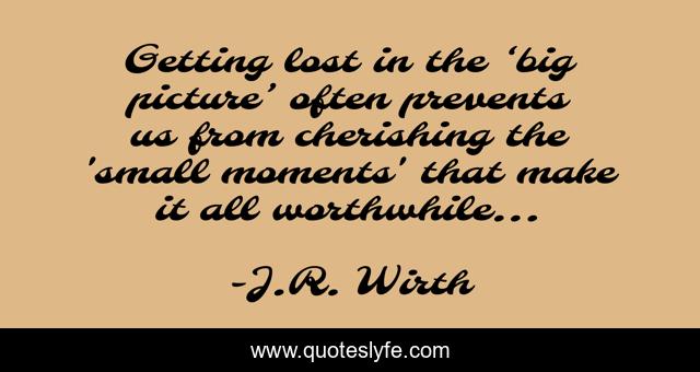 This page presents the quote "Getting lost in the ‘big picture’ often prevents us from cherishing the 'small moments' that make it all worthwhile...". Author of this quote is J.R. Wirth. This quote is about gratitude, smell-the-roses,.