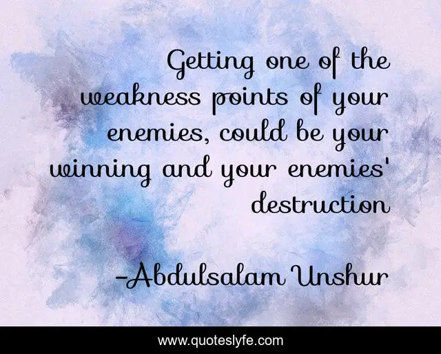 This page presents the quote "Getting one of the weakness points of your enemies, could be your winning and your enemies' destruction". Author of this quote is Abdulsalam Unshur. This quote is about enemy, challenges-of-life, winning, inpirational, weakness,.