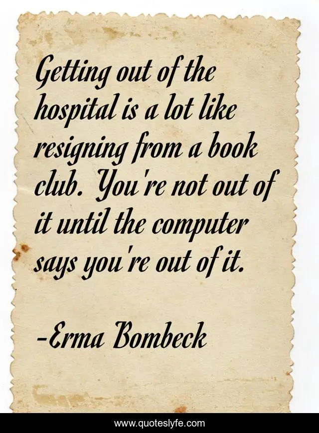 This page presents the quote "Getting out of the hospital is a lot like resigning from a book club. You're not out of it until the computer says you're out of it.". Author of this quote is Erma Bombeck. This quote is about hospital, book,.