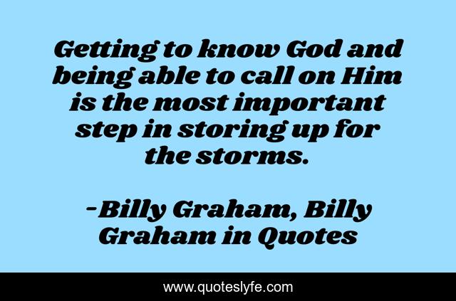 This page presents the quote "Getting to know God and being able to call on Him is the most important step in storing up for the storms.". Author of this quote is Billy Graham, Billy Graham in Quotes. This quote is about god, billy-graham,.