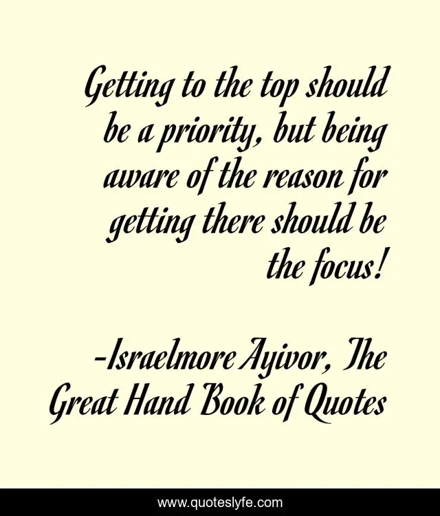 This page presents the quote "Getting to the top should be a priority, but being aware of the reason for getting there should be the focus!". Author of this quote is Israelmore Ayivor, The Great Hand Book of Quotes. This quote is about topmost, food-for-thought, hard-work, work-hard, getting, top, work, reach, success,.