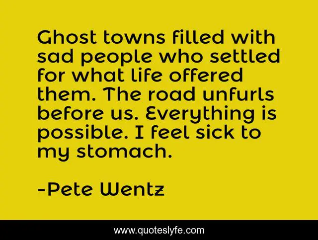 This page presents the quote "Ghost towns filled with sad people who settled for what life offered them. The road unfurls before us. Everything is possible. I feel sick to my stomach.". Author of this quote is Pete Wentz. This quote is about ghost-towns, road, sad,.