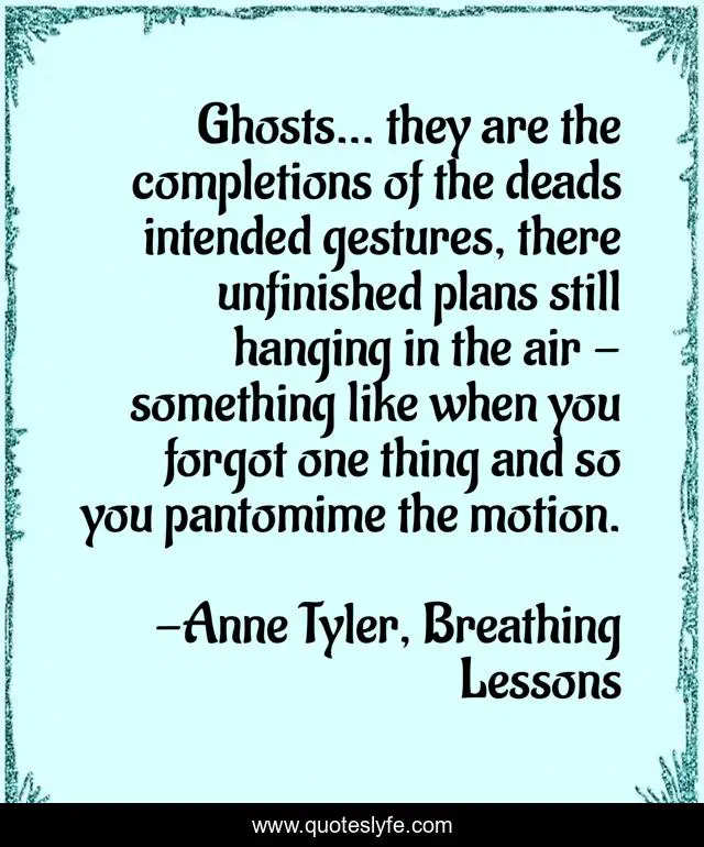 This page presents the quote "Ghosts... they are the completions of the deads intended gestures, there unfinished plans still hanging in the air - something like when you forgot one thing and so you pantomime the motion.". Author of this quote is Anne Tyler, Breathing Lessons. This quote is about inspirational-attitude, ghosts, life,.