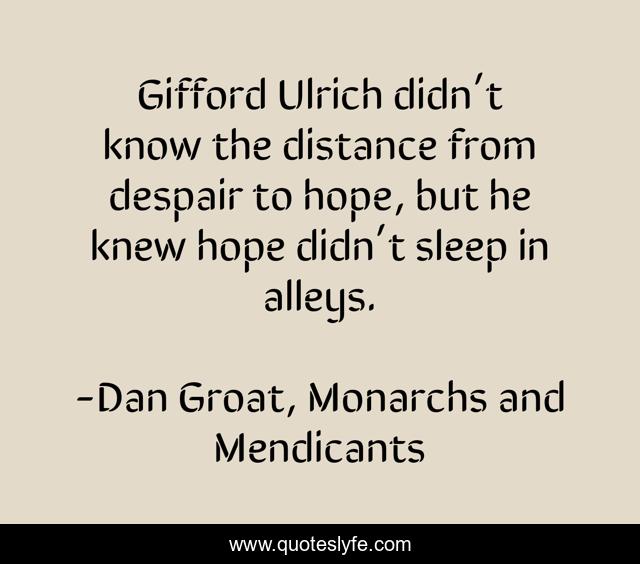 This page presents the quote "Gifford Ulrich didn’t know the distance from despair to hope, but he knew hope didn’t sleep in alleys.". Author of this quote is Dan Groat, Monarchs and Mendicants. This quote is about hopeful, alley, despair, alleys, despair-hope, alleyway, hope,.