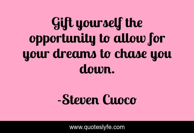 This page presents the quote "Gift yourself the opportunity to allow for your dreams to chase you down.". Author of this quote is Steven Cuoco. This quote is about brainy, quote-of-the-day, enthusiasm, inspirational, quotes-about-life, quotes-to-live-by, brainy-words,.