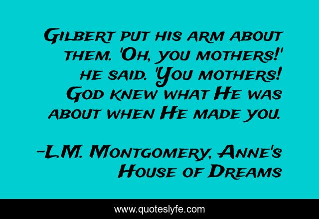 This page presents the quote "Gilbert put his arm about them. 'Oh, you mothers!' he said. 'You mothers! God knew what He was about when He made you.". Author of this quote is L.M. Montgomery, Anne's House of Dreams. .