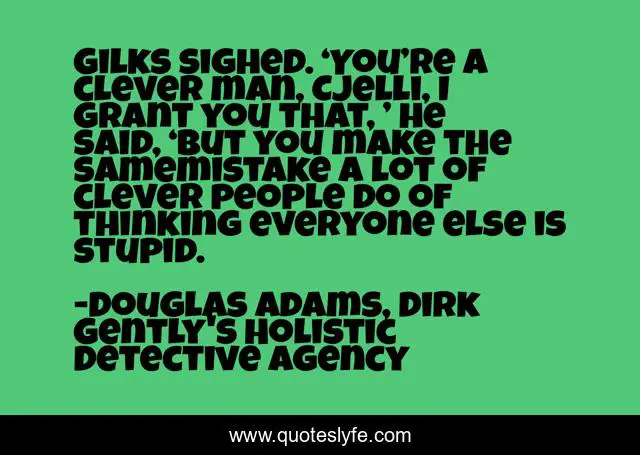 This page presents the quote "Gilks sighed. ‘You’re a clever man, Cjelli, I grant you that, ’ he said, ‘but you make the samemistake a lot of clever people do of thinking everyone else is stupid.". Author of this quote is Douglas Adams, Dirk Gently's Holistic Detective Agency. This quote is about intelligence, mistakes,.