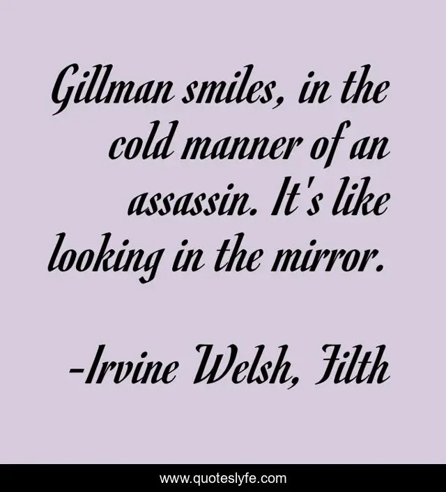 This page presents the quote "Gillman smiles, in the cold manner of an assassin. It's like looking in the mirror.". Author of this quote is Irvine Welsh, Filth. This quote is about assasin, coldness, reflection, mirror,.