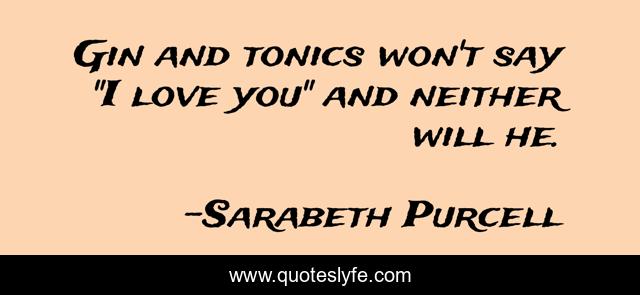 This page presents the quote "Gin and tonics won't say "I love you" and neither will he.". Author of this quote is Sarabeth Purcell. This quote is about drinking, page-24, alcohol, sarabeth-purcell, love-is-the-drug,.
