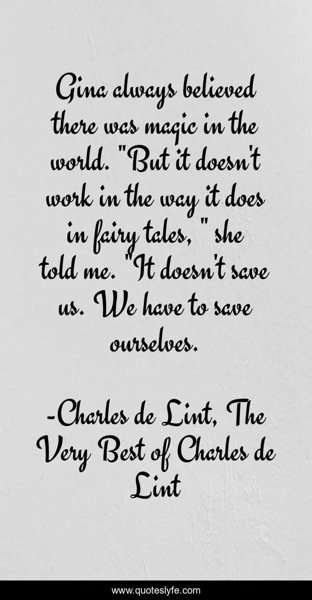 This page presents the quote "Gina always believed there was magic in the world. "But it doesn't work in the way it does in fairy tales, " she told me. "It doesn't save us. We have to save ourselves.". Author of this quote is Charles de Lint, The Very Best of Charles de Lint. .