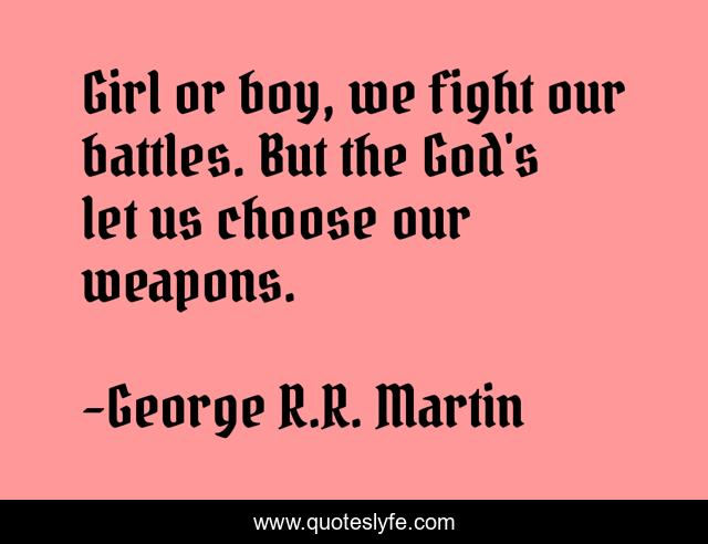 This page presents the quote "Girl or boy, we fight our battles. But the God's let us choose our weapons.". Author of this quote is George R.R. Martin. This quote is about stregnth, feminism, inspirational, enthusiasm,.