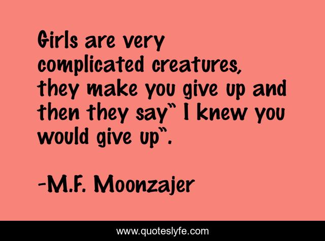 This page presents the quote "Girls are very complicated creatures, they make you give up and then they say” I knew you would give up”.". Author of this quote is M.F. Moonzajer. This quote is about girls, creatures, give-up, complicated,.