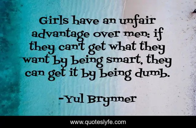This page presents the quote "Girls have an unfair advantage over men: if they can't get what they want by being smart, they can get it by being dumb.". Author of this quote is Yul Brynner. This quote is about men, smart,.