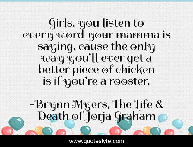 This page presents the quote "Girls, you listen to every word your mamma is saying, cause the only way you'll ever get a better piece of chicken is if you're a rooster.". Author of this quote is Brynn Myers, The Life & Death of Jorja Graham. This quote is about paranormal-urban-fantasy-romance, demonic-hero, demons, witches,.
