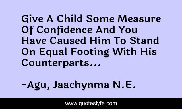 This page presents the quote "Give A Child Some Measure Of Confidence And You Have Caused Him To Stand On Equal Footing With His Counterparts...". Author of this quote is Agu, Jaachynma N.E.. This quote is about life, knowledge, family, success-self-improvement, wisdom, inspirational-attitude, confidence-and-attitude, happiness-positive-outlook, children,.