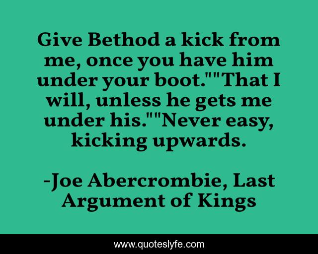 This page presents the quote "Give Bethod a kick from me, once you have him under your boot.""That I will, unless he gets me under his.""Never easy, kicking upwards.". Author of this quote is Joe Abercrombie, Last Argument of Kings. This quote is about status, challenge,.
