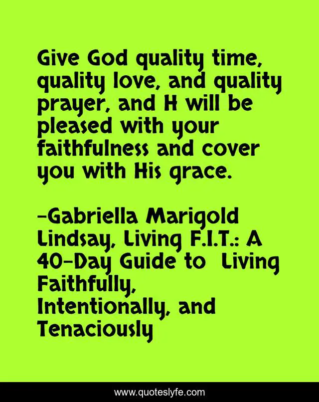 This page presents the quote "Give God quality time, quality love, and quality prayer, and H will be pleased with your faithfulness and cover you with His grace.". Author of this quote is Gabriella Marigold Lindsay, Living F.I.T.: A 40-Day Guide to Living Faithfully, Intentionally, and Tenaciously. This quote is about faith, faithfulness-of-god, faithful, god, grace-of-god, christian, prayer, faithfulness, time,.