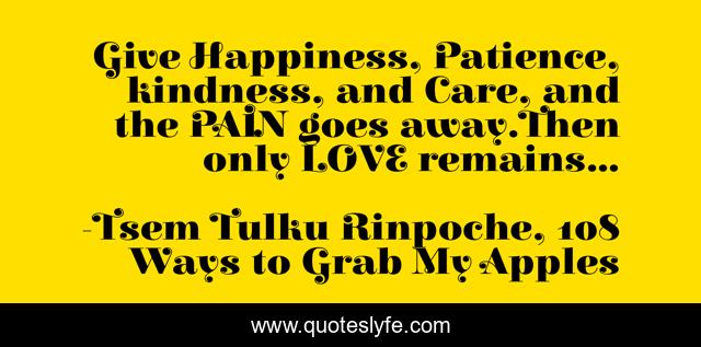 This page presents the quote "Give Happiness, Patience, kindness, and Care, and the PAIN goes away.Then only LOVE remains...". Author of this quote is Tsem Tulku Rinpoche, 108 Ways to Grab My Apples. This quote is about love, patience, happiness, kindness, affection, care,.