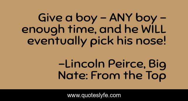 This page presents the quote "Give a boy - ANY boy - enough time, and he WILL eventually pick his nose!". Author of this quote is Lincoln Peirce, Big Nate: From the Top. .