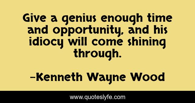 This page presents the quote "Give a genius enough time and opportunity, and his idiocy will come shining through.". Author of this quote is Kenneth Wayne Wood. .