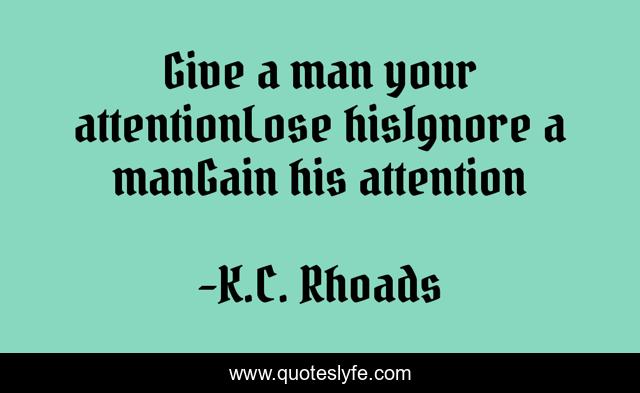 This page presents the quote "Give a man your attentionLose hisIgnore a manGain his attention". Author of this quote is K.C. Rhoads. This quote is about relationships, attention, men,.